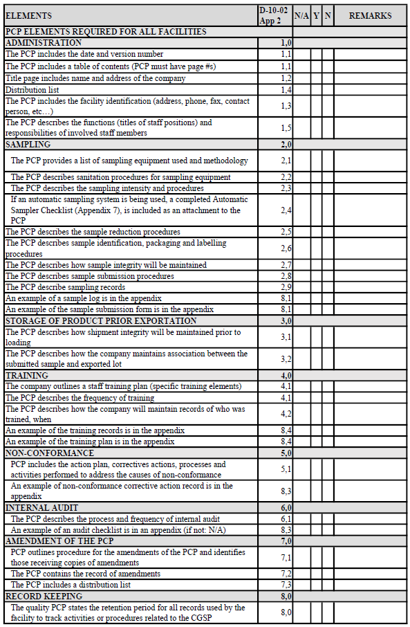 During the audit, the CFIA will assess if the company can comply with the procedures outlined in their PCP and if those procedures meet the requirements of the CGSP. For third party samplers, the CFIA's scheduling of the authorization audit will involve an on-site visit at a company's facility.
