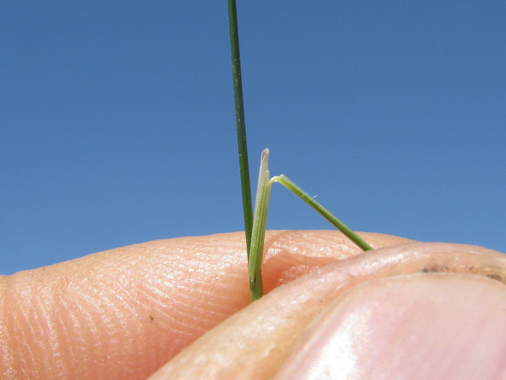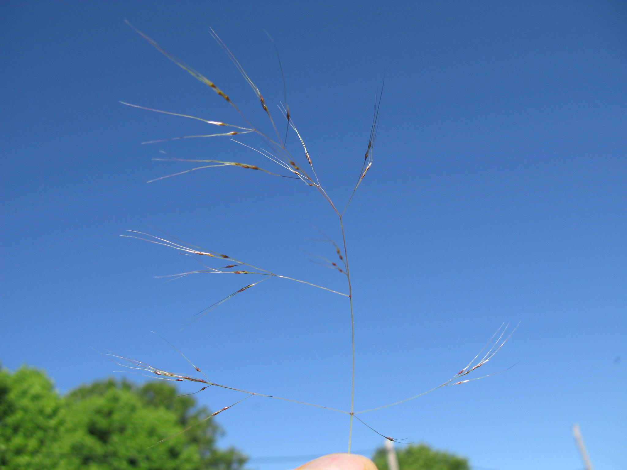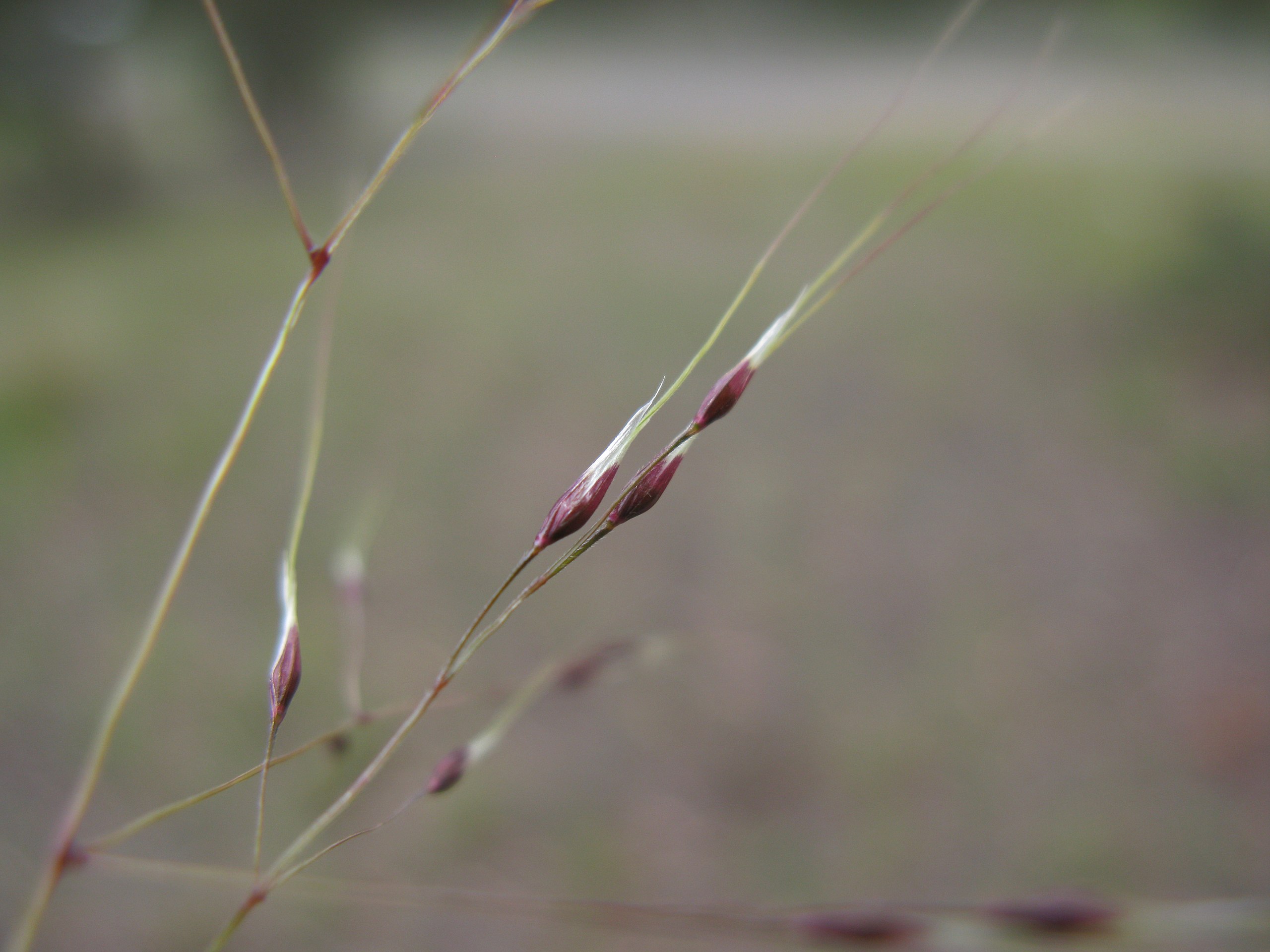 Serrated tussock is a tussock-forming grass that can grow up to 70 cm tall. Its roots are deep and fibrous. The leaves are thin, hairless, tightly rolled (can be rolled smoothly like needles between fingers) and have small, easily felt serrations along their edges. The inflorescences are long, branched, purplish, and bend toward the ground. The dispersed seed unit is a floret. The florets are light brown and have a hairy, pointed base and flat top; the upper half is bumpy and ends in a long awn (bristle-like appendage).