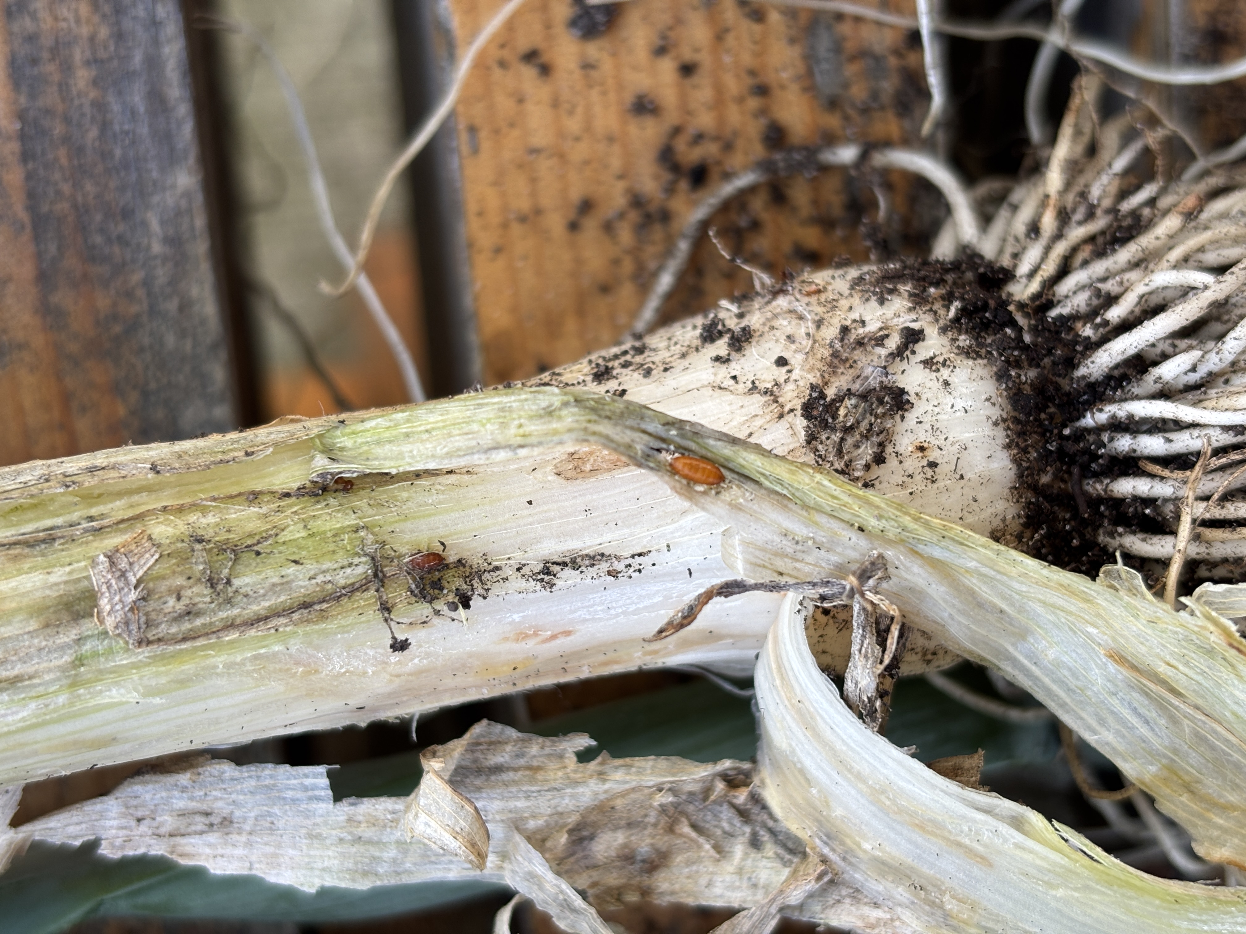 À mesure qu'elles grandissent, les larves se déplacent vers le bulbe et les gaines foliaires, où elles se nymphosent. Les galeries creusées dans les tissus rendent la plante vulnérable aux infections fongiques et bactériennes.