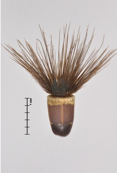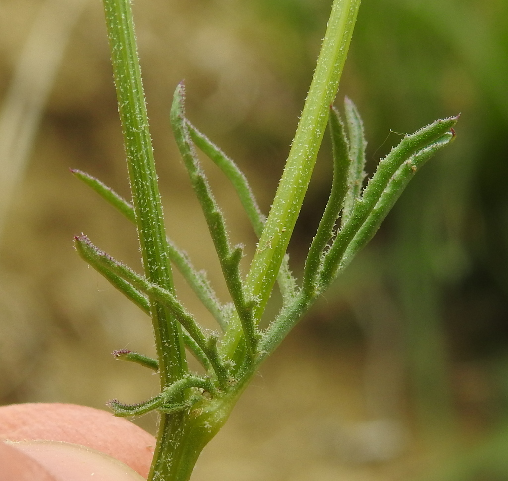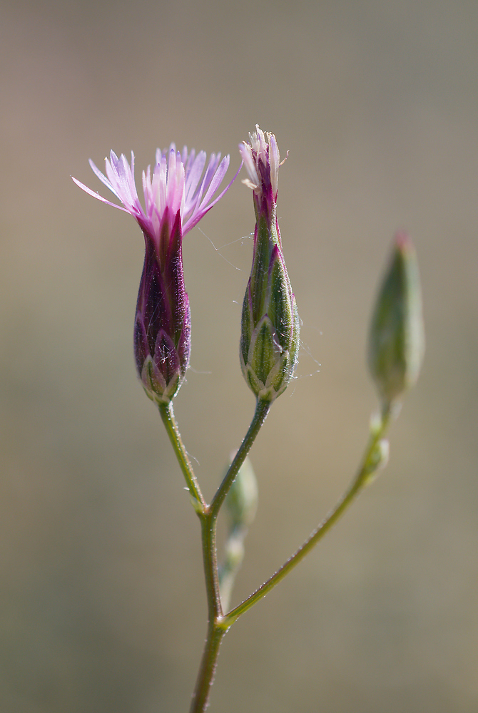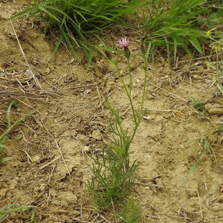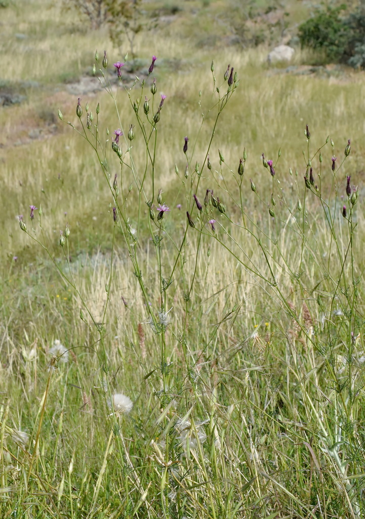 La crupine est une plante annuelle d'hiver qui germe et forme une rosette de feuilles basales oblongues ou ovoïdes à l'automne et s'allonge et fleurit l'année suivante. La tige florale peut atteindre environ 1 m de haut. Les feuilles caulinaires diminuent de taille vers le haut de la plante et sont de plus en plus lobées, se divisant finement en segments linéaires. Elles ont des bords grossiers et rugueux. Les fleurs ont des pétales rose-mauve et poussent dans des capitules en forme de vase d'environ 1,3 cm de long. La semence est grossièrement cylindrique et possède une touffe dense de poils brun noirâtre au sommet.